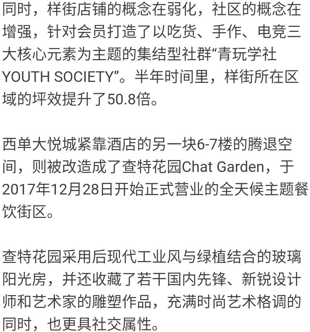细分业态主题化的加快,也使得购物中心为了增强差异化的优势,项目内甚至集合了多个主题街区,例如北京西单大悦城已经是“样街(潮流)+查特花园(餐饮)”、北京朝阳大悦城是“悦界(生活方式)+悦色(设计师零售)+拾间(餐饮)”的配置。