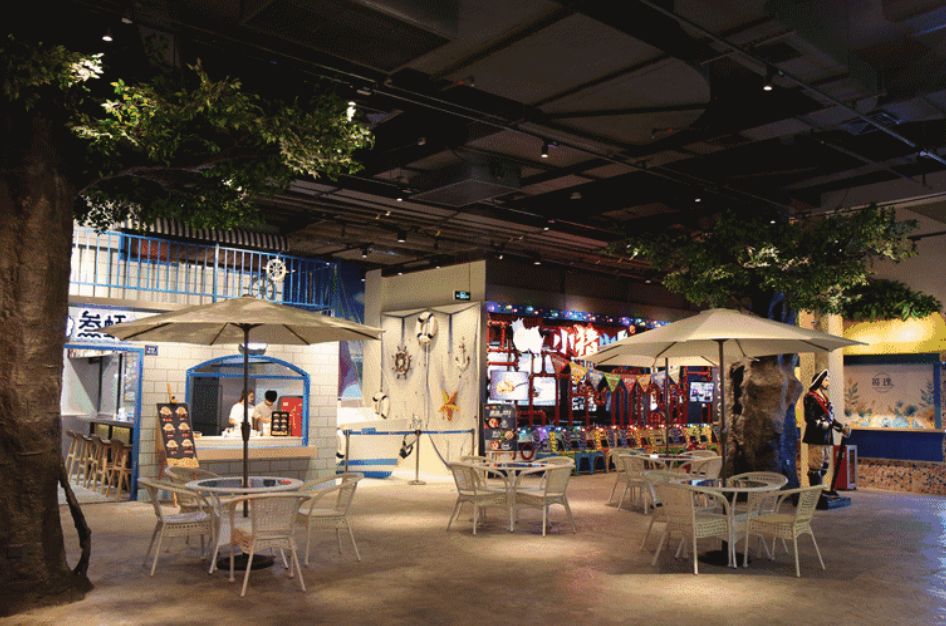 占地3500平方米的海湾街区,布置了帆船沙滩、守望灯塔、时空邮局等场景。街区的小中庭,则通过仿真树、休闲遮阳椅等元素营造出“室内空间户外体验”的氛围。
